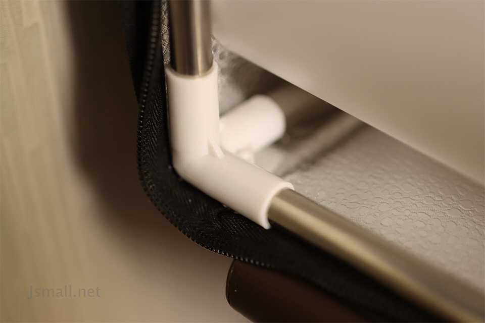 연결부위는 이렇게 흰색 플라스틱으로 금속으로된 봉을 각 모서리마다 붙잡고 있는데